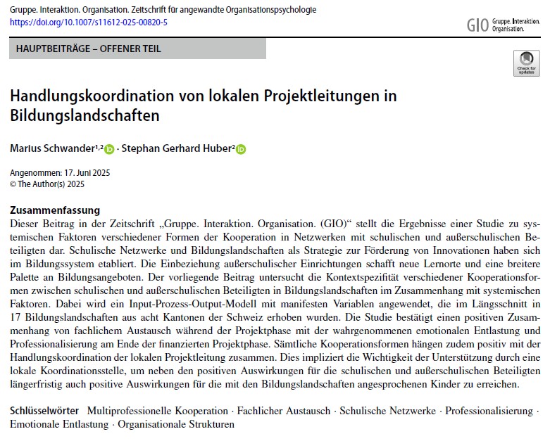 Der vorliegende Beitrag untersucht die Kontextspezifität verschiedener Kooperationsformen zwischen schulischen und außerschulischen Beteiligten in Bildungslandschaften im Zusammenhang mit systemischen Faktoren. Dabei wird ein Input-Prozess-Output-Modell mit manifesten Variablen angewendet, die im Längsschnitt in 17 Bildungslandschaften aus acht Kantonen der Schweiz erhoben wurden. Die Studie bestätigt einen positiven Zusammenhang von fachlichem Austausch während der Projektphase mit der wahrgenommenen emotionalen Entlastung und Professionalisierung am Ende der finanzierten Projektphase. Sämtliche Kooperationsformen hängen zudem positiv mit der Handlungskoordination der lokalen Projektleitung zusammen. Dies impliziert die Wichtigkeit der Unterstützung durch eine lokale Koordinationsstelle, um neben den positiven Auswirkungen für die schulischen und außerschulischen Beteiligten längerfristig auch positive Auswirkungen für die mit den Bildungslandschaften angesprochenen Kinder zu erreichen.