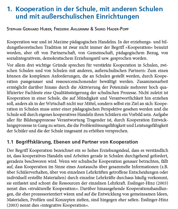 Aufgabe aller für Bildungsprozesse Verantwortung Tragender ist, durch Kooperation Entwicklungsprozesse in Gang zu setzen, die die Problemlösungsfähigkeit und Leistungsfähigkeit der Schüler und die der Schule insgesamt zu erhöhen versprechen.