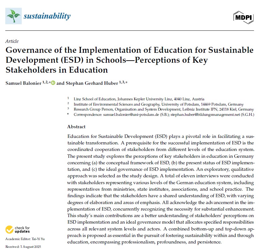 Governance of the Implementation of Education for Sustainable Development (ESD) in Schools Perceptions of Key Stakeholders in Education Balonier, S. & Huber, S.G. 2025